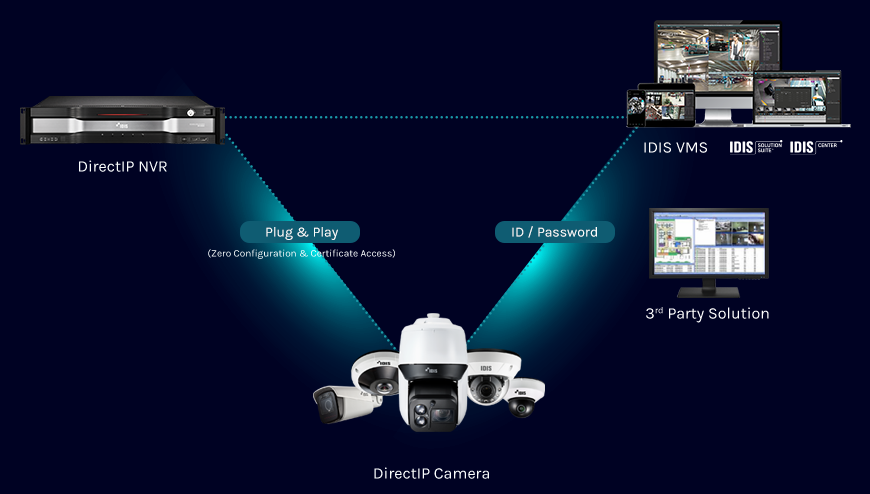 DirectIP® is a proprietary mutual authentication system supported by all IDIS IP products. When IDIS IP cameras are connected to an IDIS NVR, both devices mutually authenticate each other automatically through DirectIP®. The authentication data is stored and protected on both the IP cameras and the NVR.